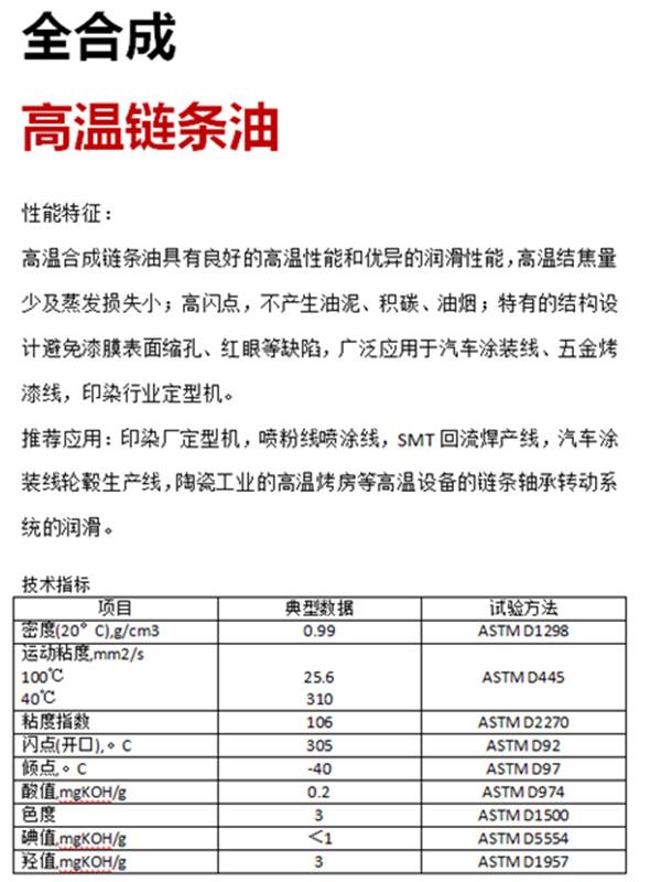 廈門威馬工貿(mào)有限公司位于美麗的花園城市-廈門市同安區(qū),公司專營合成高溫油脂系列產(chǎn)品。產(chǎn)品分為:高溫鏈條油、高溫潤滑脂、高低溫潤滑脂等系列油品。廣泛應(yīng)用于:定型機(jī)、噴涂/噴粉、巖棉等高溫潤滑設(shè)備,本品無煙,無殘渣,屬于全合成高溫油系列,可寄樣試用,長期服務(wù)全國客戶。